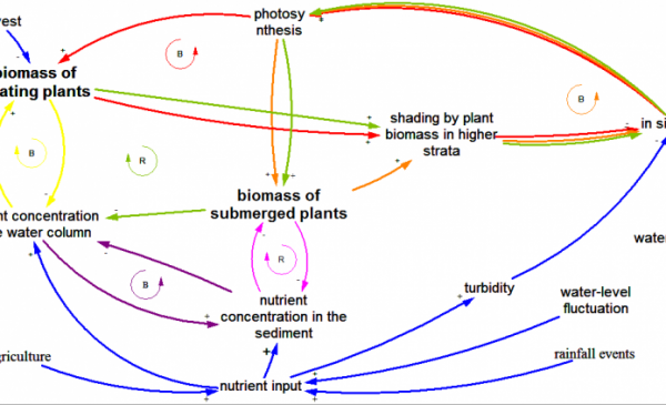 Nutrient recycling feedback (reinforcing, local scale, well-established): When there are no submerged plants holding down the sediment on the floor of the water body, the nutrients trapped in the sediment become resuspended in the water column, further raising the nutrient levels in the water column.