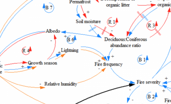 Another leverage point originates from fire management  practices, which is the most direct effect humans can have on fire regime dynamics. Through changes in fire suppression management, the fire severity and forest heterogeneity can be influenced . A decrease in fire severity implies deeper soil organic layer which favours the coniferous trees (see B1). Forestry practices could enhance the heterogeneity of the forest which limits the spread and severity of the fires (see B2 feedback.) (Johnstone et al., 2010 ; Kelly et al., 2012). Allowing distant fires (i.e. fires not too close to communities) to burn under controlled conditions conditions could have a cooling effect at regional scale in interior Alaska due to higher albedo of post-fire deciduous species compared to previous coniferous forest (Chapin et al.,2008).
