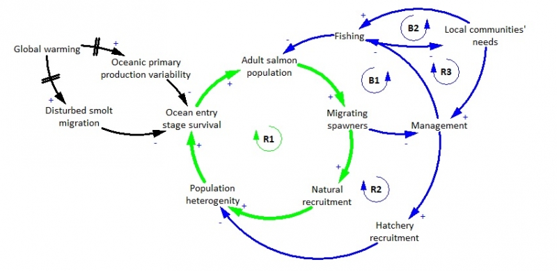 Salmon population dynamics in the Alaskan system maintain equilibrated number of individuals, if the system is not affected by external anthropogenic disturbances, as paleo-records show (Rogers et al. 2013). Alaskan local communities have needs in terms of food security, income, recreation, education, and other. To cover for these needs they rely on fishing as their main activity (Schindler et al. 2010), and salmon not only has a value in food and nutrition, but also is one of the major drivers of the local economy, ensuring several aspects of wellbeing (Schindler et al. 2010). These needs therefore cause the necessity for fishing economically valuable salmon at their life stage of adulthood. At the same time, being identified as a common pool resource, there is a necessity to apply management on the resource, to avoid potential issues of non-excludability and conflict among users. Management therefore regulates the fishery using as proxy the amount of salmon returning upstream to spawn (Schindler et al. 2010). To sustain high enough levels of catch hatching activity is also implemented by management (Schindler et al. 2008). These variables related to the social drivers of the system are mutually affected through feedback systems.